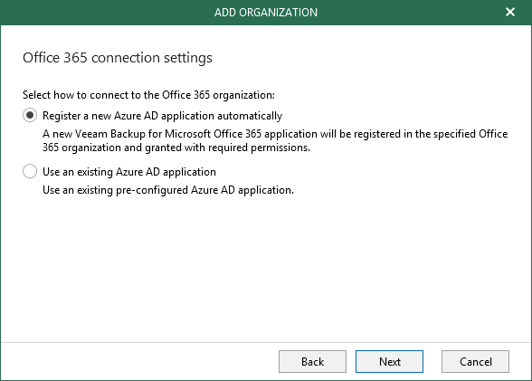 At this step of the wizard, choose whether you want to register a new Azure AD application to connect to your Microsoft Office 365 organization or use an existing AD application.