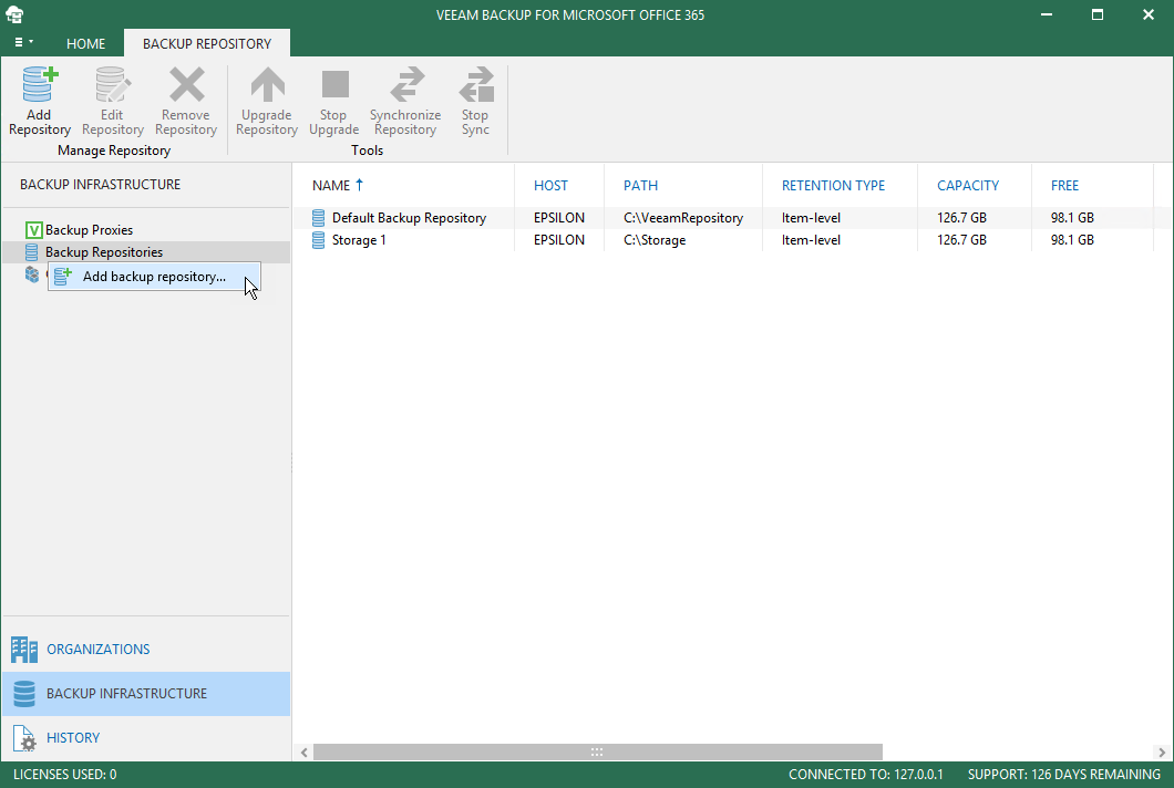 Alternatively, in the inventory pane, right-click the Backup Repositories node and select Add backup repository.