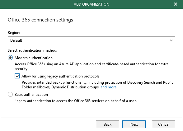 - Select the Modern authentication option and the Allow for using legacy authentication protocols check box to connect to your Microsoft Office 365 organization.
