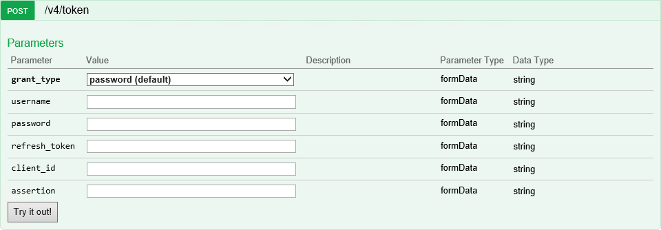 - Expand the Auth resource and click POST /v4/token