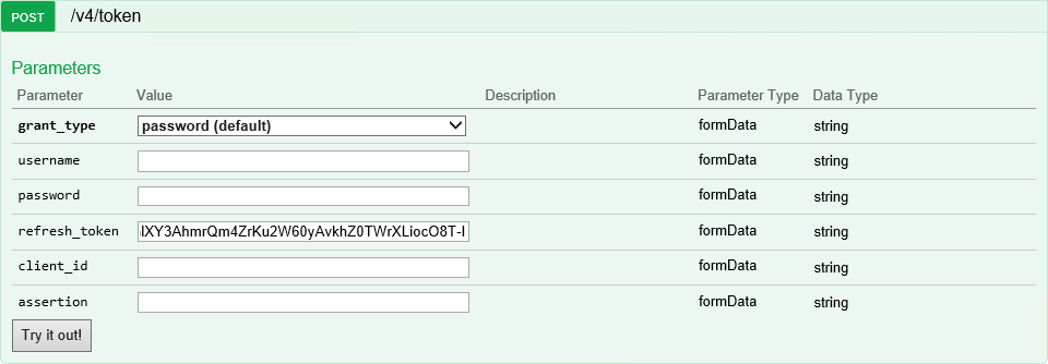- For the grant_type parameter, make sure that password (default) value is chosen.