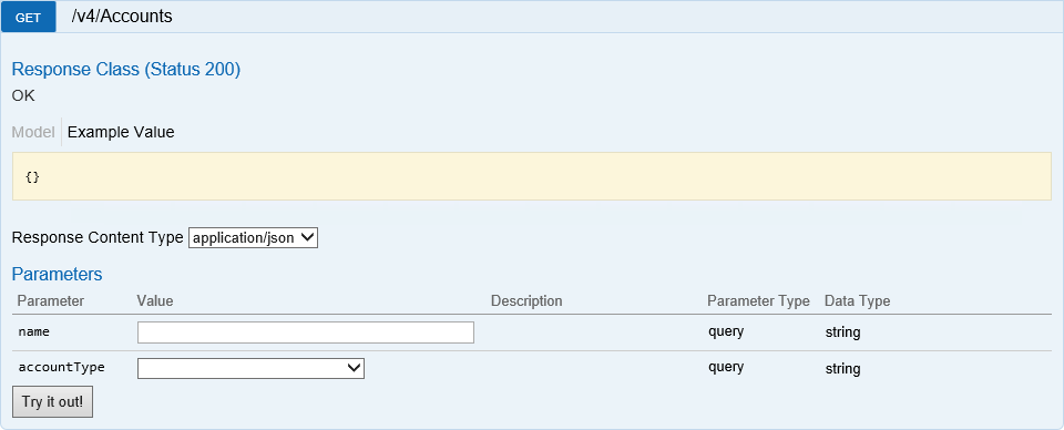 Choose the resource and the request method, add parameters (if needed) and click Try it out! to send the request.