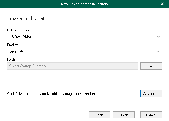 Make sure that the bucket you want to use to store your data was created in advance; Veeam Backup for Microsoft Office 365 does not support creating new buckets.