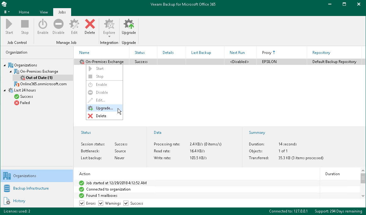 Alternatively, in the preview pane, right-click a backup job and select Upgrade.