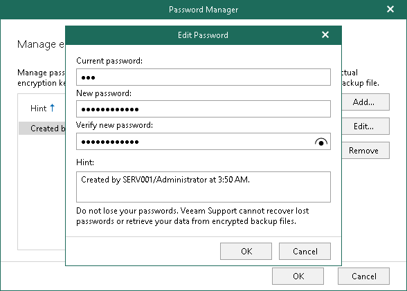 Veeam Backup for Microsoft Office 365 allows you to edit and remove passwords.