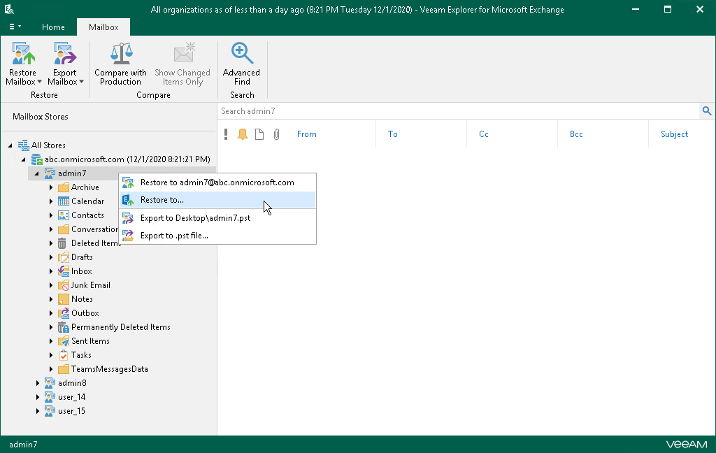 2. On the Mailbox/Folder/Items tab, select Restore Mailbox/Restore Folder/Restore Item > Restore to or right-click a mailbox, folder or an item and select Restore to.