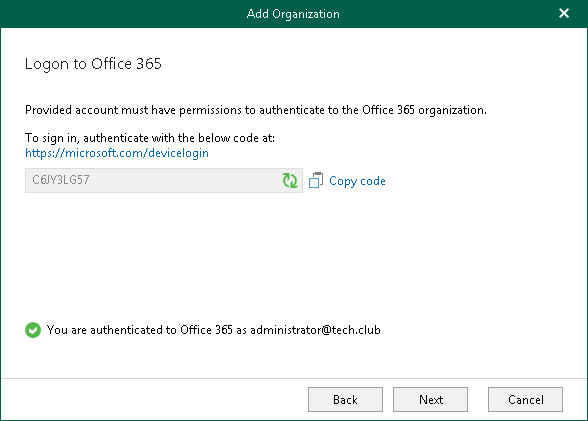 At this step of the wizard, log in to your Microsoft Office 365 organization.