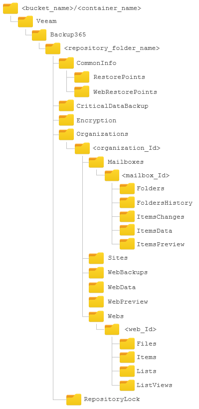 <bucket_name/container_name>/Veeam/Backup365/ | A set of mandatory folders created by Veeam Backup for Microsoft Office 365. |