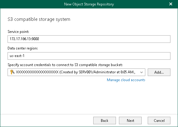 At this step of the wizard, specify a service point of your S3 Compatible device, select a datacenter region and specify account credentials.
