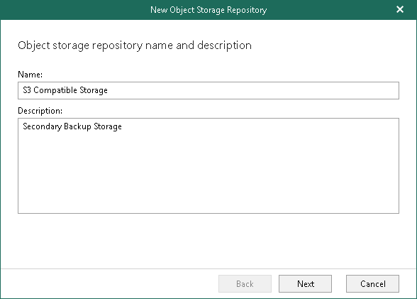 This is an archive version of the document. To get the most up-to-date information, see the current version. Step 2. Specify Object Storage Repository Name At this step of the wizard, enter a name for the object storage repository and provide optional description:In the Name field, specify a new name for the object storage repository.In the Description field, enter a description (optional).