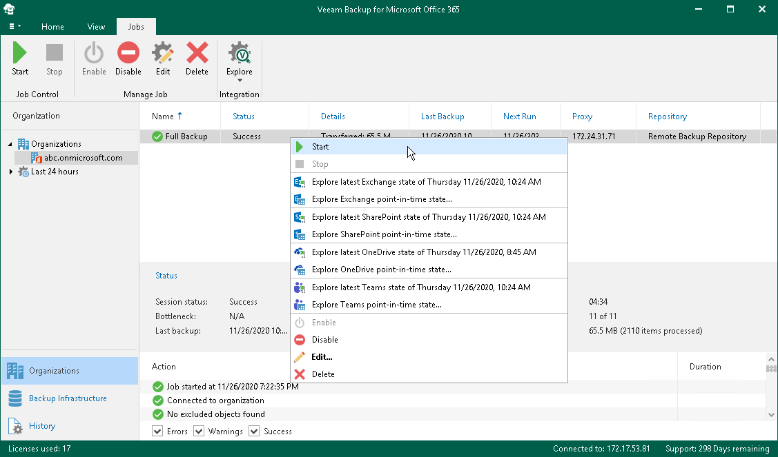 Alternatively, in the preview pane, right-click a backup job and select Start.