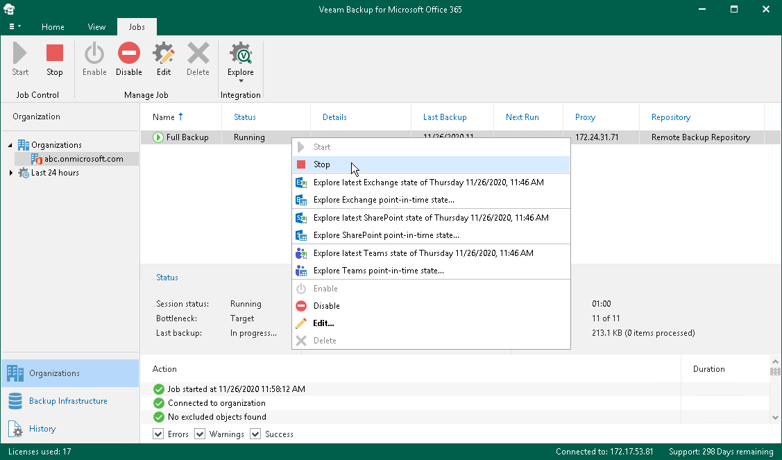 When Veeam Backup for Microsoft Office 365 stops a backup job, it preserves the data that has already been backed up. If you want to continue, use the Start command. For more information, see Starting Backup Job.