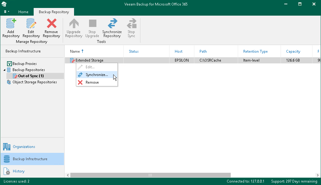 The Synchronize Repository option allows you to synchronize cache between object storage and extended backup repositories.