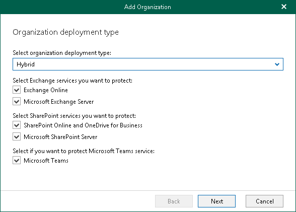 Veeam Backup for Microsoft Office 365 allows you to create hybrid configurations consisting of Microsoft Office 365 organizations and on-premises Microsoft Exchange/SharePoint organizations.