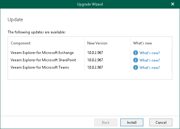 - After you launch the Veeam Backup for Microsoft Office 365 console, you will be offered to upgrade Veeam Explorer for Microsoft Exchange, Veeam Explorer for Microsoft SharePoint and Veeam Explorer for Microsoft Teams.