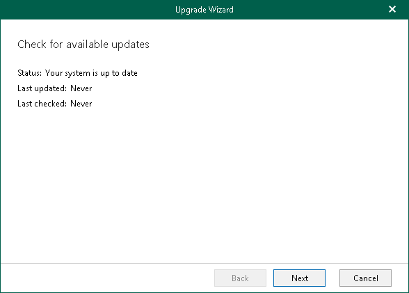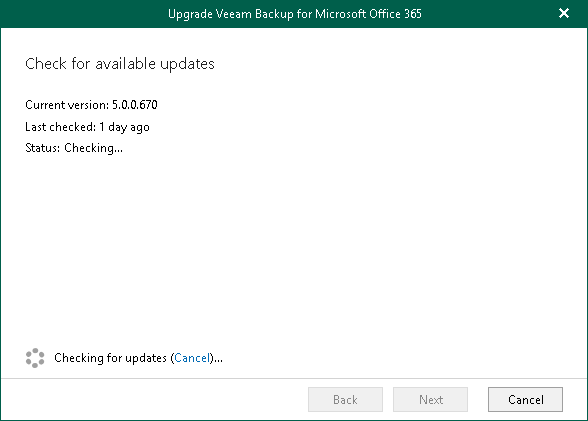 - Wait until Veeam Backup for Microsoft Office 365 checks whether a newer version is available.