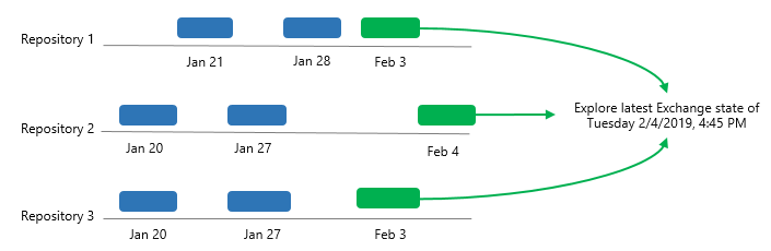 The following is an example of exploring a single organization with backups that are stored in three different backup repositories. In such a scenario, the following restore points will be merged and loaded into the Veeam Explorer scope: