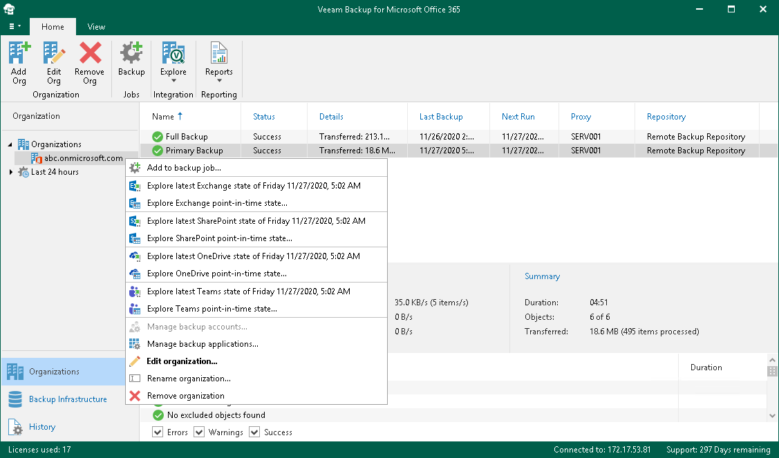 When exploring a single organization, Veeam Backup for Microsoft Office 365 merges and loads the latest restore points that have been created by each backup job of the selected organization.