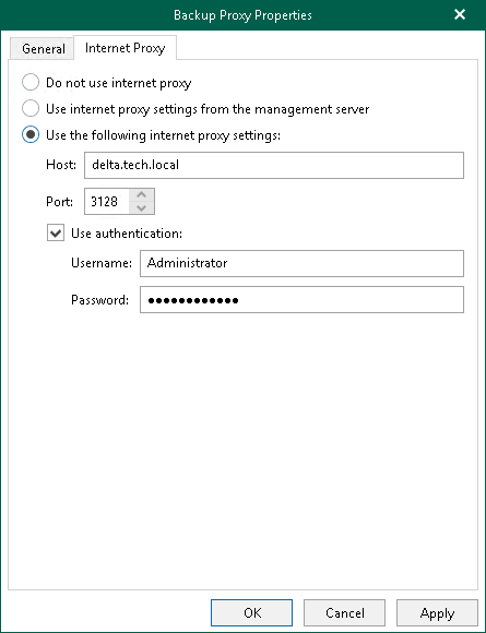 - Do not use internet proxy. Select this option if your backup proxy server has direct access to the internet and you do not want to use any other internet proxy servers.