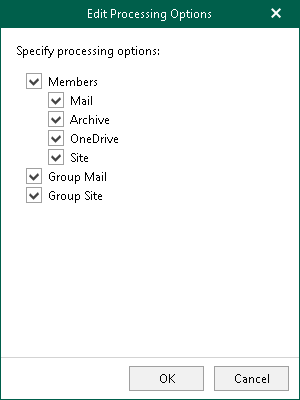 Each of these object types (except for the Sites and Teams types) consists of a set of processing/exclusion options such as Mail, Archive, OneDrive, Site, Group Mail and Group Site which you can select/deselect to make data retrieval even more precise.