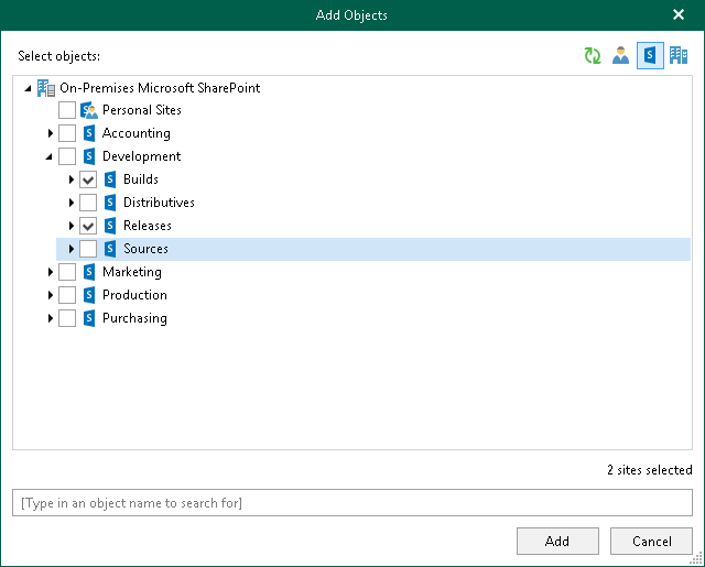 In the following example, you can select either the root Development site, which automatically selects all of its subsites, or you can select, for example, Builds and Releases. In the latter case, the root Development site will be deselected.