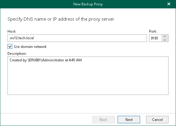 - If you want to add a domain backup proxy server, select the Use domain network check box. Otherwise, Veeam Backup for Microsoft Office 365 will add a workgroup backup proxy server. For more information, see Backup Proxy Deployment Scenarios.