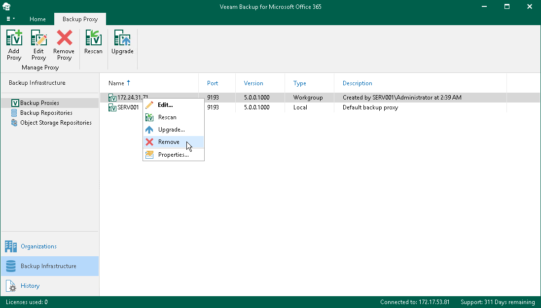 You can remove a backup proxy server from the Veeam Backup for Microsoft Office 365 backup infrastructure if you no longer need it.
