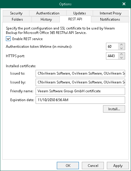 To configure Veeam Backup for Microsoft Office 365 REST API settings, do the following: