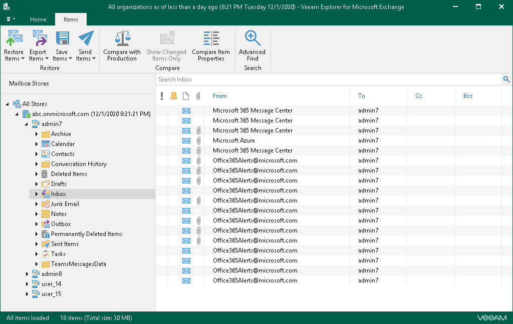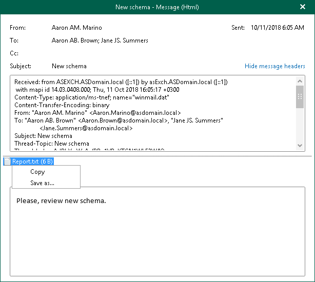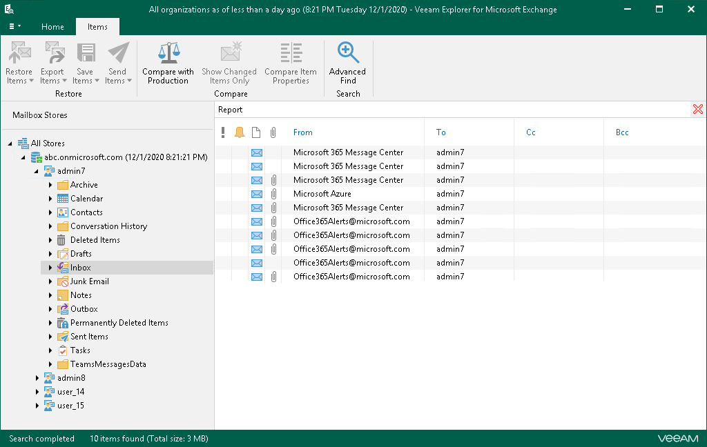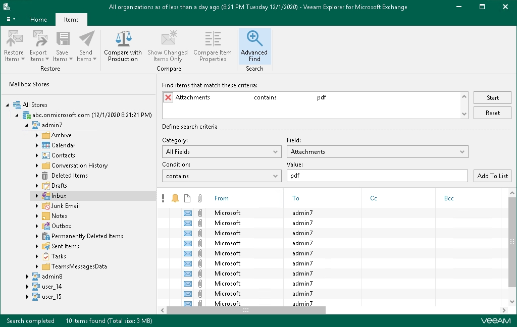 You can use Veeam Explorer for Microsoft Exchange to view the contents of a backup file, open messages, search for items in a backup file and customize criteria of your search.