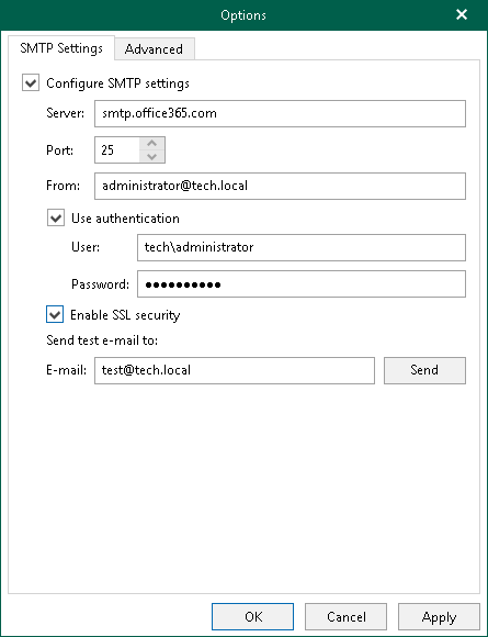 - In the Server field, specify a DNS name or IP address of the SMTP server.