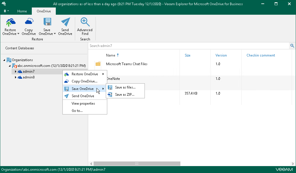 Alternatively, in the inventory pane, right-click an organization with OneDrives and select Save OneDrives > Save as files or Save OneDrives > Save as ZIP.