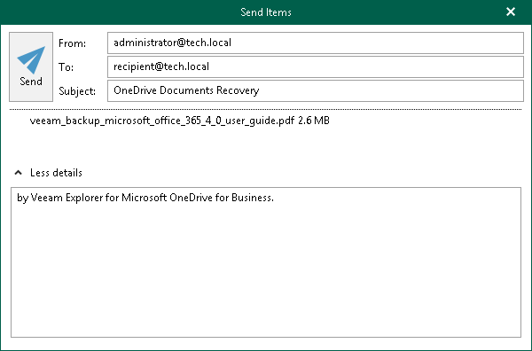 Veeam Explorer for Microsoft OneDrive for Business allows you to send OneDrive data to specified recipients by email.