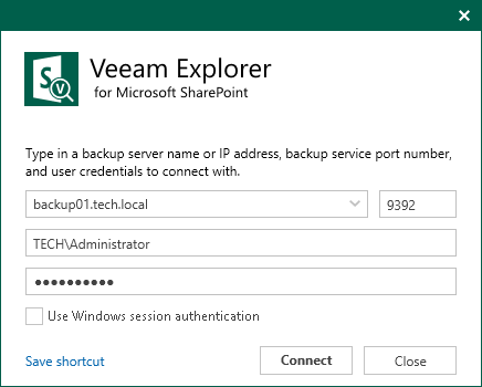 To use the account under which Veeam Explorer for Microsoft SharePoint is running, select Use Windows session authentication.