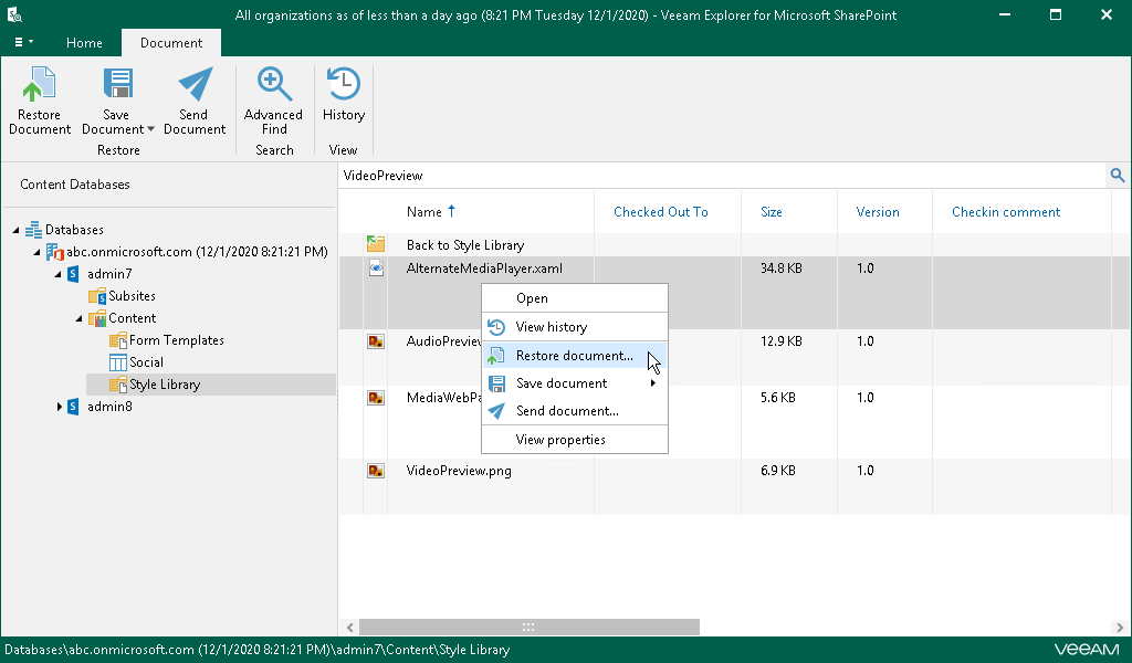 - On the Document tab, select Restore Document or Restore Item or right-click an object and select Restore document or Restore item.