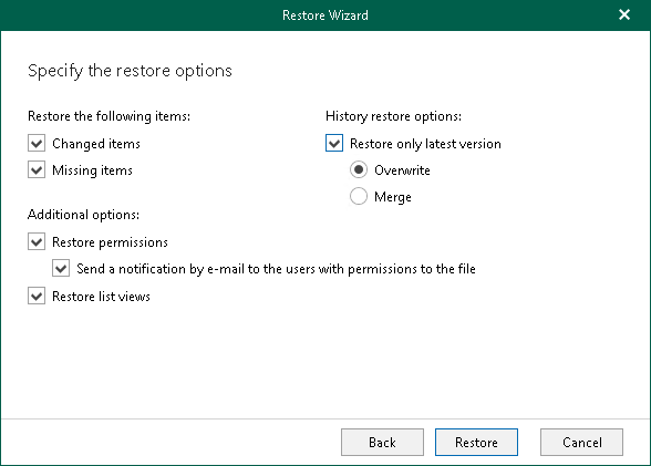 The Send a notification by e-mail to the users with permissions to the file check box is only available when restoring data from backups created in Veeam Backup for Microsoft Office 365 for Microsoft Online organizations. |