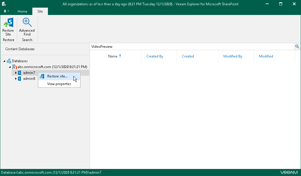 - On the Site tab, select Restore Site or right-click a site and select Restore site.