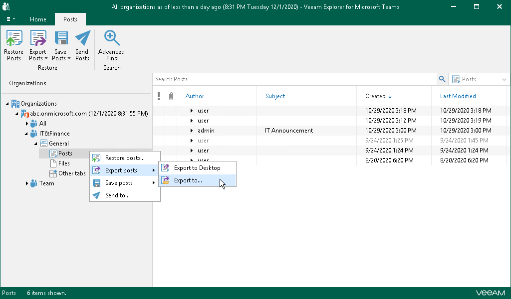 - Export to Desktop. Select this option if you want to perform the 1-Click Export operation. Veeam Explorer for Microsoft Teams will immediately export all posts of the channel to the Desktop folder.