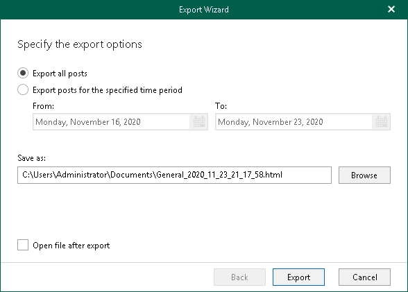 - Export all posts. If you select this option, Veeam Explorer for Microsoft Teams will export all posts published in the channel to an HTML file.