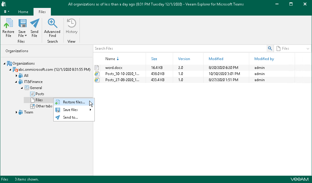 - In the navigation pane, expand a channel whose files you want to restore and select Files.
