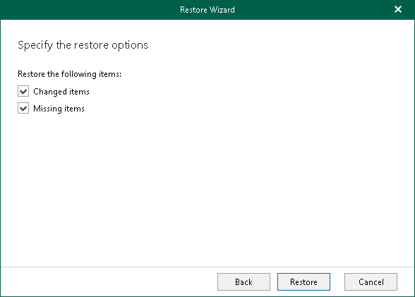 - Select the Missing items check box if you want to restore items that are missing in the target location. For example, some of the items were removed and you want to restore them from the backup.