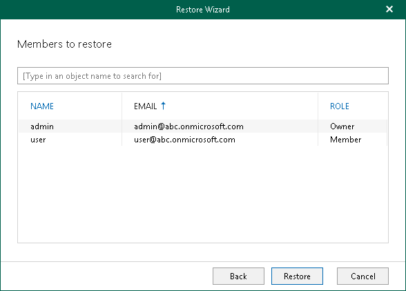 This step is available if you launched the Restore wizard to restore a specific team and selected the Restore membership and their permissions check box at the previous step of the wizard.