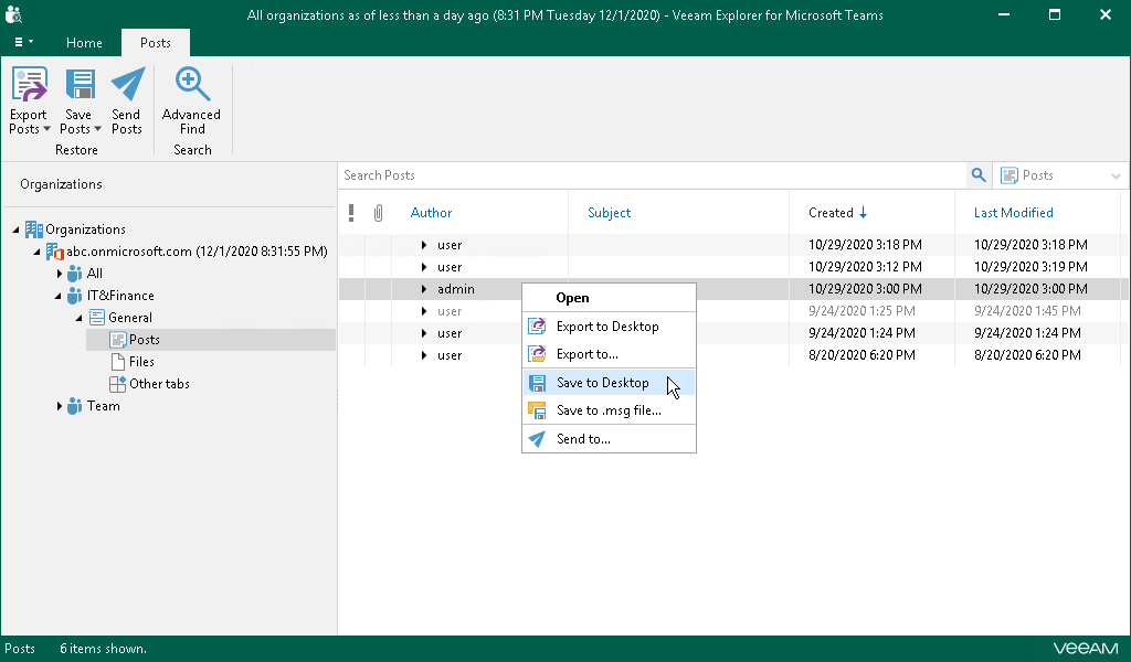 - Save to <folder_name>. Select this option if you want to perform the 1-Click Save operation. Veeam Explorer for Microsoft Teams will save posts to the latest location that was used when saving posts. If you have not saved posts yet, Veeam Explorer for Microsoft Teams save posts to the Desktop folder.