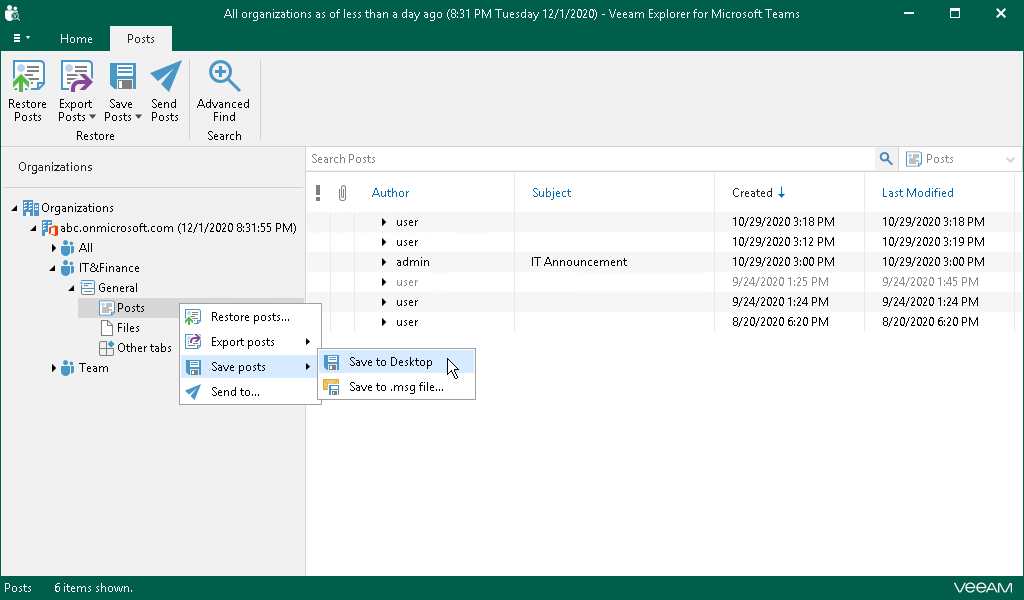 You can use Veeam Explorer for Microsoft Teams to save posts published in a team channel as Microsoft Exchange Mail Document (.msg) files. You can save all posts of a channel or specific posts. Veeam Explorer for Microsoft Teams saves each post to a separate .msg file in the specified location.