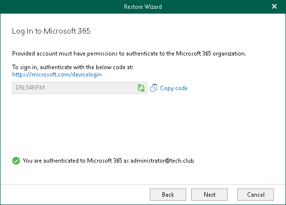 At this step of the wizard, log in to your Microsoft 365 organization.