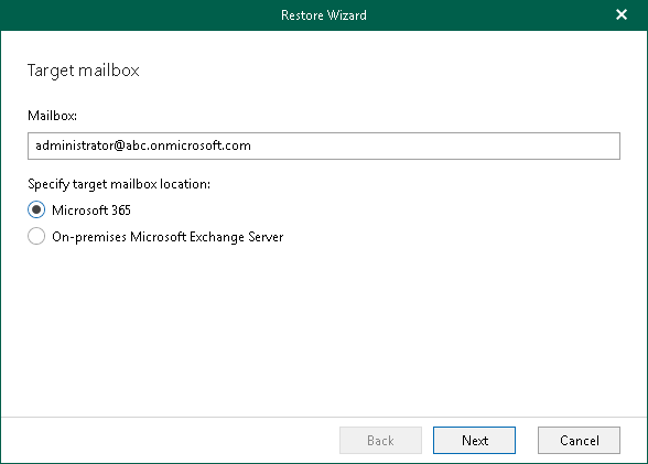 At this step of the wizard, specify the target mailbox and mailbox location.