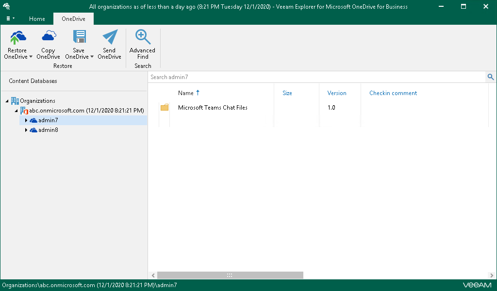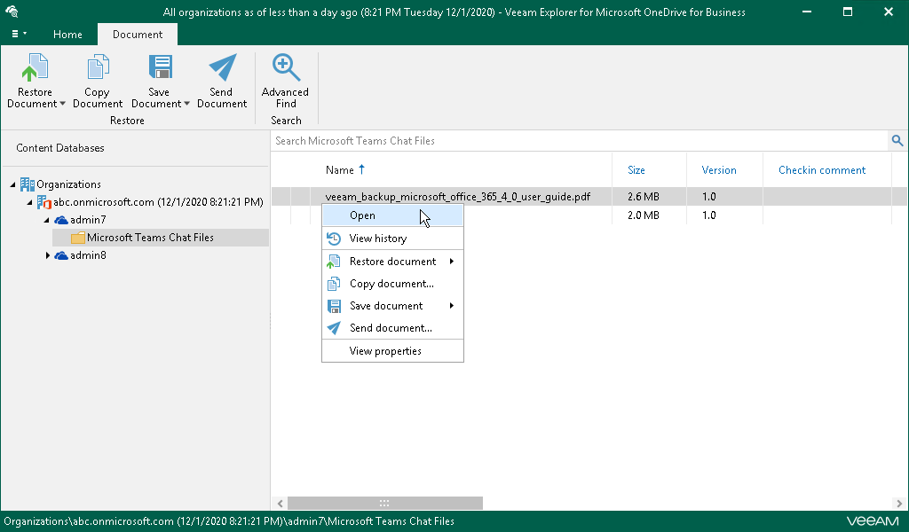 You can use Veeam Explorer for Microsoft OneDrive for Business to view the contents of a backup file, view object properties, open files, search for items in a backup file and customize criteria of your search.