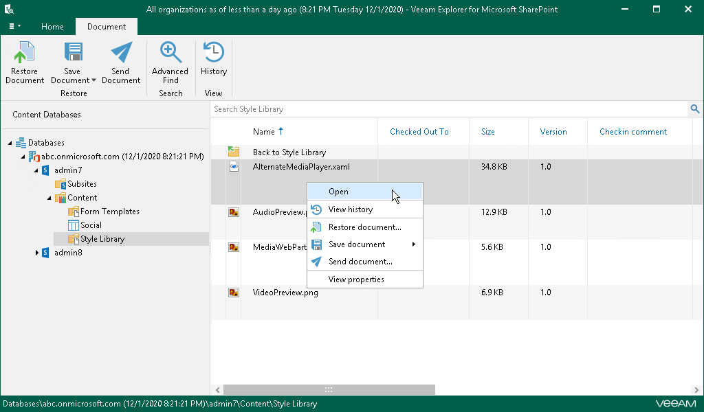 You can use Veeam Explorer for Microsoft SharePoint to view the contents of a backup file, view object properties, open files, search for items in a backup file and customize criteria of your search.