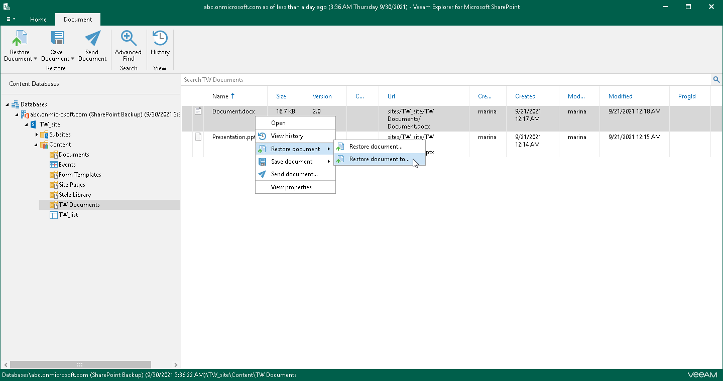 - Right-click a document and select Restore document > Restore document to.