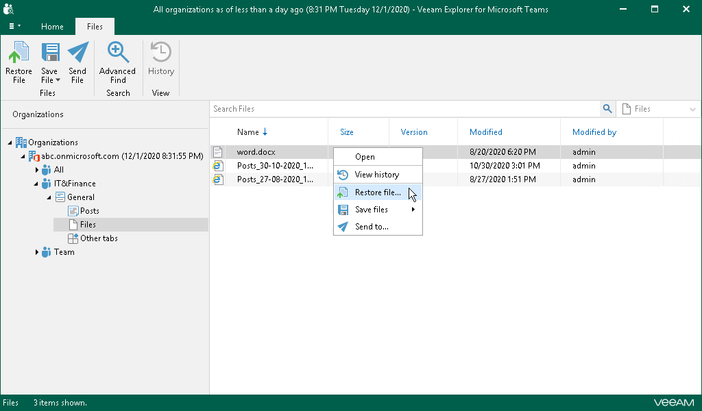 - Expand a channel whose files you want to restore, select Files and on the Files tab, click Restore File on the ribbon.