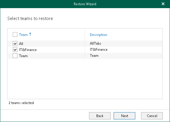 This is an archive version of the document. To get the most up-to-date information, see the current version. Step 4. Select Teams This step is only available if you launched the Restore wizard to restore multiple teams.At this step of the wizard, select check boxes next to the teams that you want to restore.